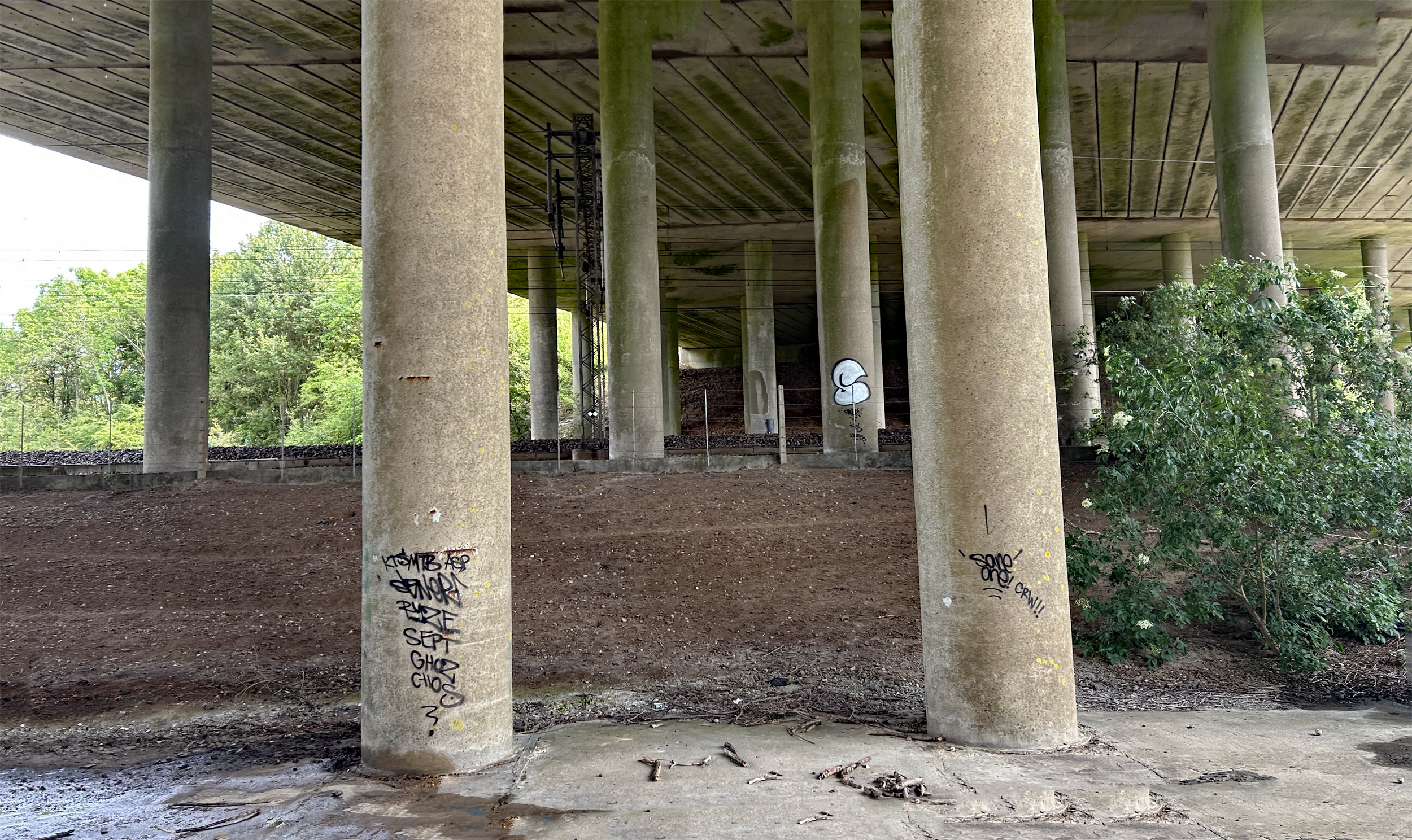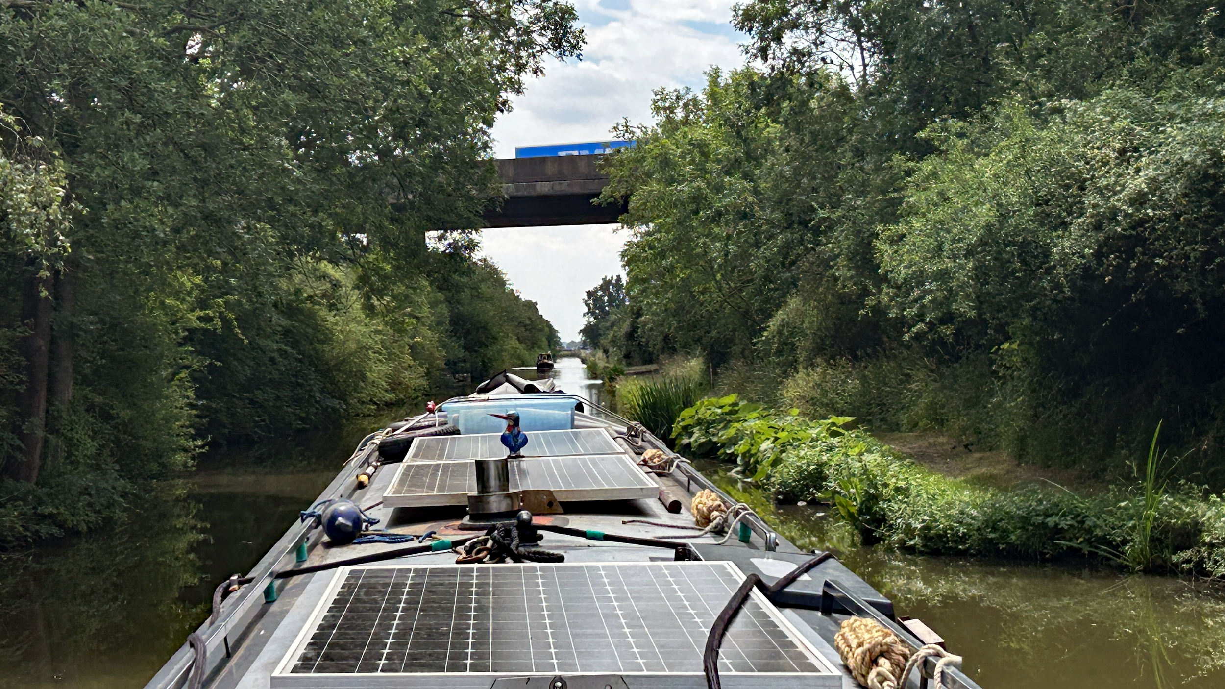 Despite the traffic rushing over it the M6 looks quite small and insignificant from a boat on the canal until you actually pass under it and view the forest of concrete columns that support it.