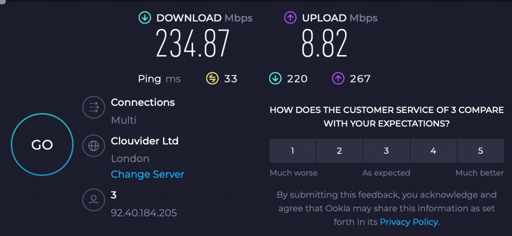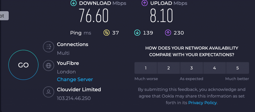 The results have been very pleasing, our old  system internet speeds has generally Been around 10/15mbs but now is consistently better, the best we have seen was as the picture below:-
