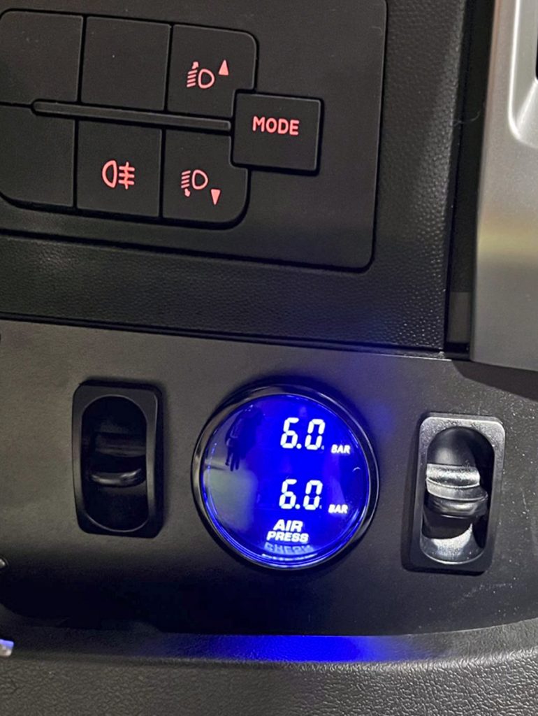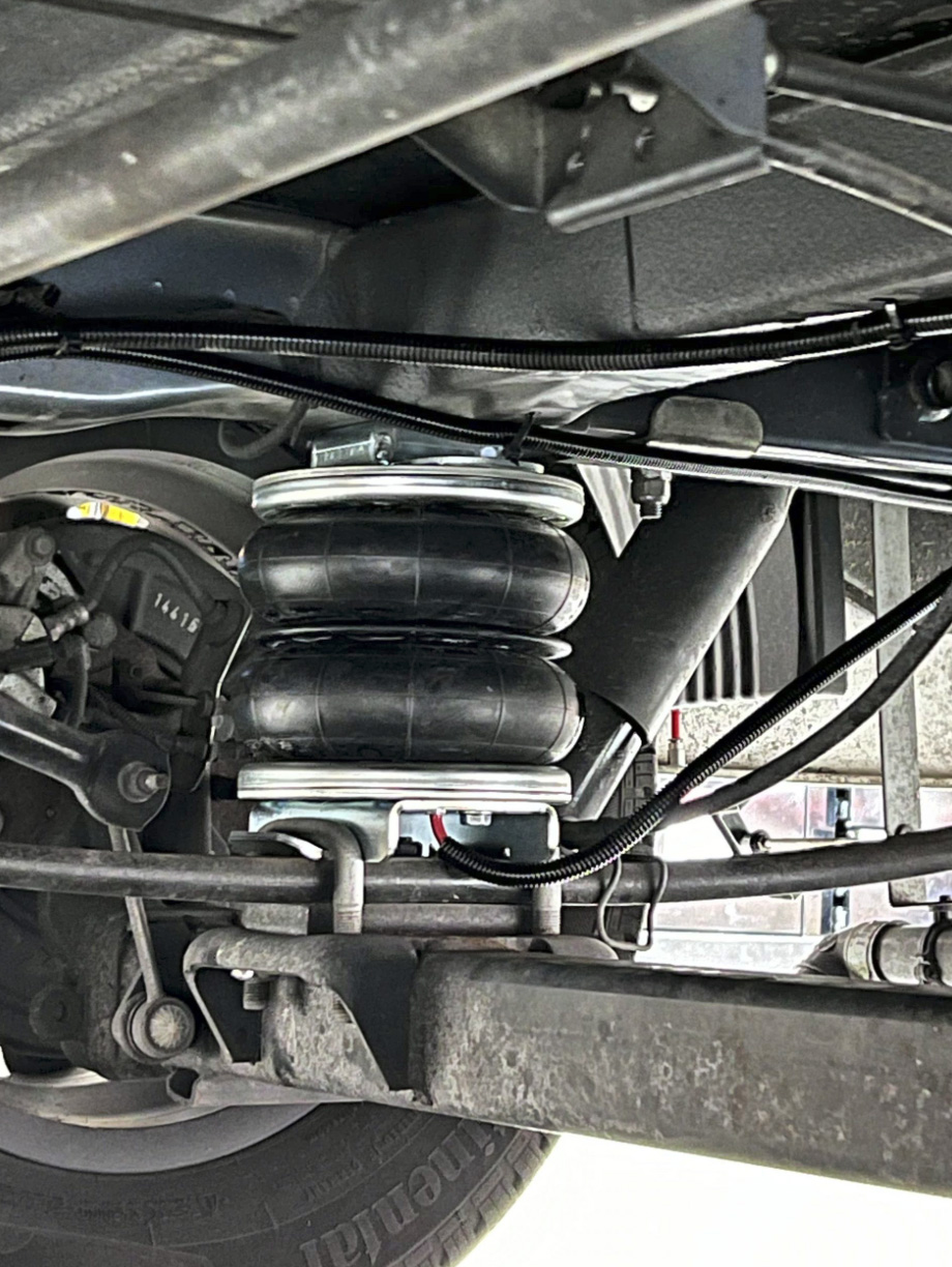 In a nutshell the bump stops are removed and bespoke air bags are mounted between the existing leaf springs and vehicle chassis. A compressor is installed (in our case under the floor, but inside the cabin, on the drivers side) to pump up the airbags. The airbags are generally run at between 2.5 and 3 bar, whatever best suits your particular driving style and motorhome, then when in danger of grounding you can increase the pressure up to 6 bar too raise the back of the motorhome to board a ferry etc., but this of must done at a crawl and the pressure reduced before normal driving is resumed.